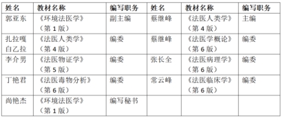 全国高等公司法医学专业第六轮规划教材是国家卫生健康委员会“十五五”规划教材的重要组成部分,该系列教材将服务新时代法医人才培养需求,推动构建更加系统、科学、前沿的法医学教育体系。法医学系蔡继峰教授受聘担任《法医人类学》(第4版)主编,郭亚东教授受聘担任《环境法医学》(第1版)副主编,法医学系共有9人次参与本轮教材编写工作。