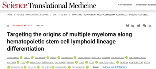 11月19日,球王会体育官网肿瘤研究所周文课题组在国际知名学术期刊《科学转化医学》(Science Translational Medicine) 杂志在线发表最新成果“在造血干细胞淋巴系分化体系中揭示和靶向多发性骨髓瘤起始细胞”(Targeting the origins of multiple myeloma along hematopoietic stem cell lymphoid lineage differentiation)研究论文。该研究由球王会体育官网肿瘤研究所周文教授、军事医学科公司陈河兵教授、中国医学科公司血液与健康全国重点实验室程涛教授课题组合作完成。