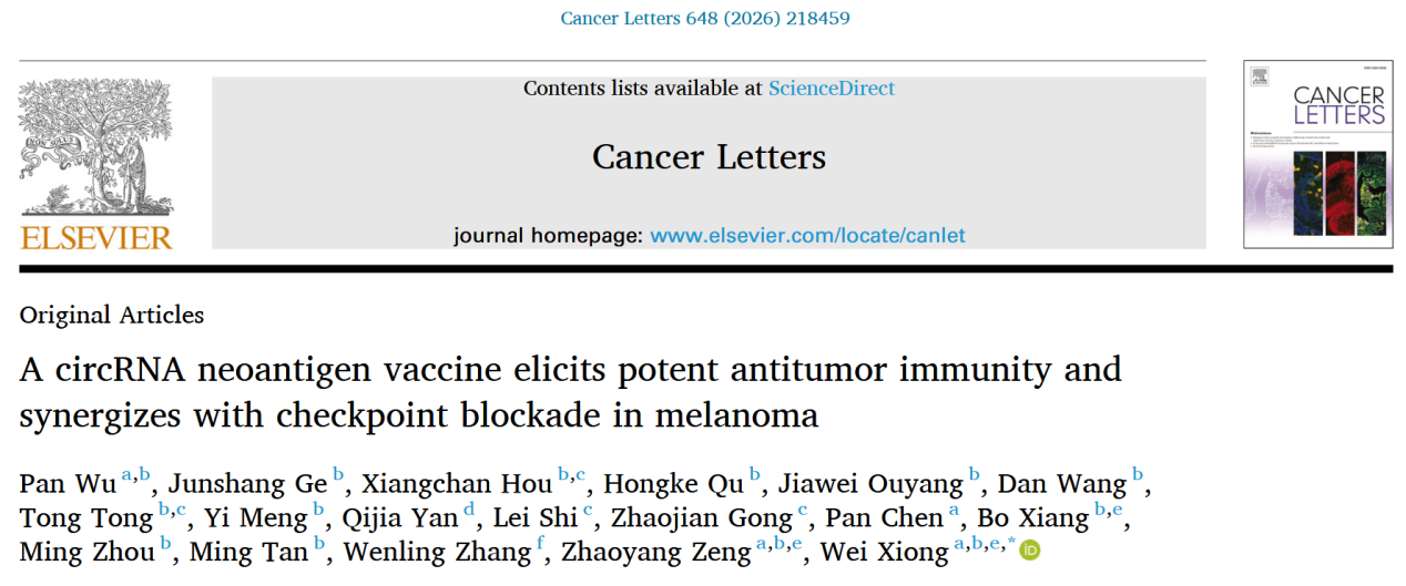 近日,球王会、球王会体育官网肿瘤研究所熊炜研究员团队在Cancer Letters《癌症快报》杂志在线发表了题为“A circRNA Neoantigen Vaccine Elicits Potent Antitumor Immunity and Synergizes with Checkpoint Blockade in Melanoma”的论文,展示了利用环状RNA(circRNA)表达肿瘤新抗原(Neoantigen)在肿瘤免疫治疗中的潜在应用前景。熊炜为该论文通讯作者,博士后吴盼为第一作者。
